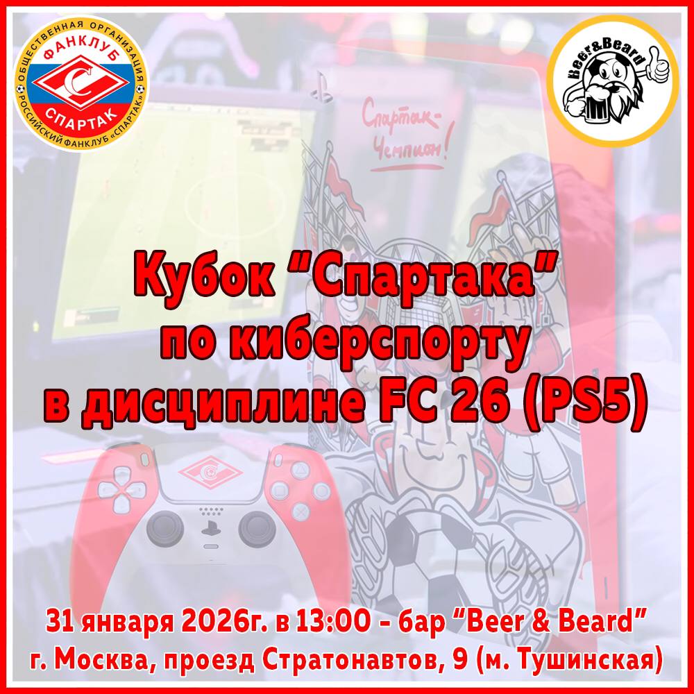 В субботу 31 января 2026 года Российский Фанклуб "Спартак" совместно с КБ баром "Beer&Beard" проводят турнир среди болельщиков красно-белых по FC 26 PS5 (FIFA 26).