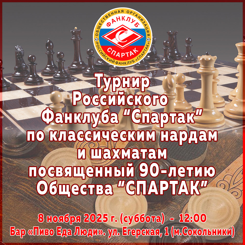 В субботу 8 ноября 2025 года в Сокольниках состоится турнир Российского Фанклуба "Спартак" по классическим нардам и шахматам. Соревнования, посвящённые 90-летию физкультурно-спортивного общества "СПАРТАК", пройдут в баре «Пиво Еда Люди».